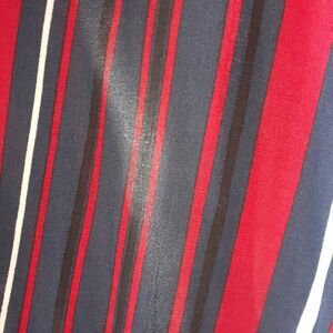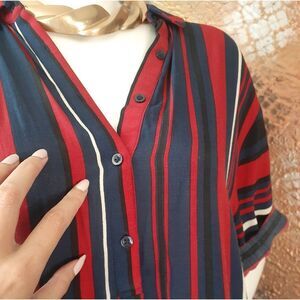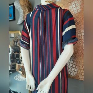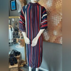 Elegant and stylish, this striped midi dress from Zara features a blend of navy, cream,, black and red hues. Perfect for any occasion, it offers a comfortable fit with a chic design. Tunic silhouette with 3/4 t shirt style sleeves and buttons to mid chest. Side vent details with front pockets. 100% viscose. Belt has been removed but still has belt loops, see pics for reference.