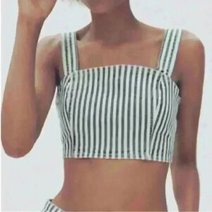 Zara Stripped Denim Crop Top Blue Navy White Square Neckline Side Zipper Size S
