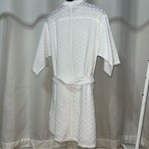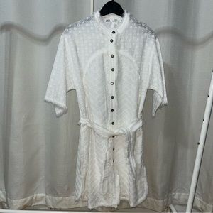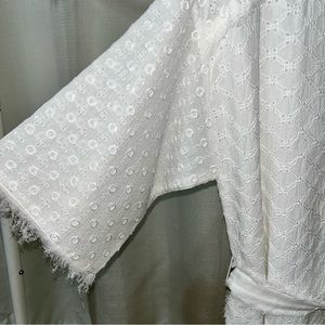 White Swiss Embroidered Kimono-style Dress with round neckline, short sleeves, front button closure and adjustable belt, side pockets, embroidered eyelet motif and frayed hem.