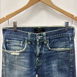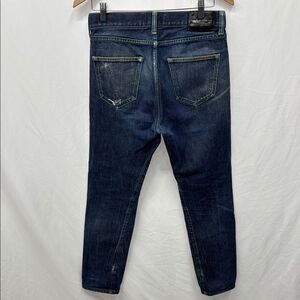 These Zara slim jeans in a classic blue hue feature a stylish distressed design, including a prominent tear at the knee. The denim showcases natural fading and whiskering, offering a vintage-inspired look with a modern fit.