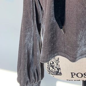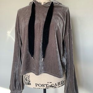 A velvety, silver-gray Zara hoodie. It is SO smooth and soft, both inside and outside. The material on the inside is cool. The fit is flowy, slightly oversized, yet the length of it is mid to short (right on or above hips). Subtle balloon sleeves. Hoodie is also oversized, it looks like a cape hood when you wear it!