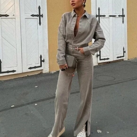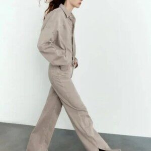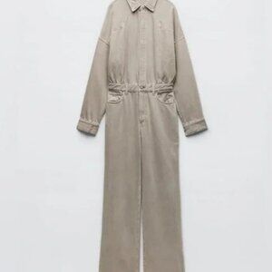 Zara TRF Long Denim Jumpsuit Taupe Gray - Blogger favorite