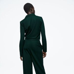 ZARA T-SHIRT WITH RUCHING DEEP GREEN. Long sleeve blouse with ruched front, deep v neck, collar. Cropped cut.