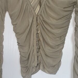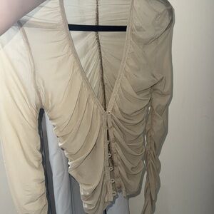 This Zara blouse in a sophisticated tan hue features a ruched design that adds texture and style. The fitted silhouette and elegant sleeve length make it a versatile addition to any wardrobe. Perfect for both casual and formal occasions, this top offers a chic and modern look.