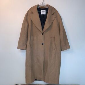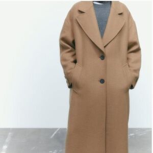 Embrace timeless elegance with this Zara tan trench coat, featuring a classic tailored design and a warm, wool-blend material. Its oversized silhouette offers a modern twist on a traditional favorite, making it a versatile addition to any wardrobe.