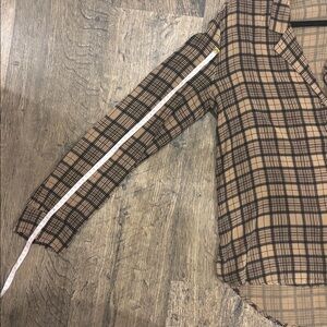 Zara shirt with a tan and black plaid pattern. Please see photos for measurements :). Gently worn. The inside tag has been cut out but the material is 55% cupro, 45% viscose.
