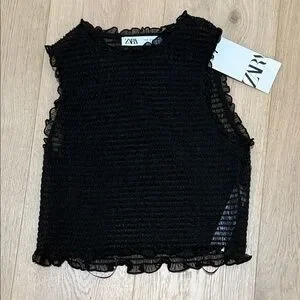 Elegant textured top with ruffle edges. Sleeveless design for versatile styling.