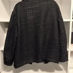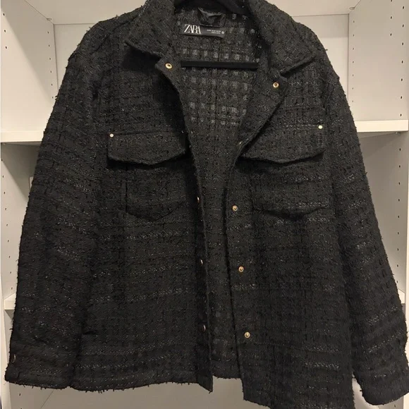 Elegant Zara jacket in black. Features a textured pattern with front pockets.