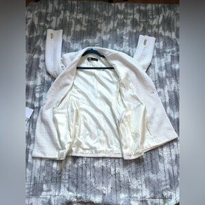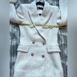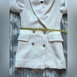 Fitted blazer with a lapel collar, long sleeves and pronounced shoulders (padded). Front flap Pockets. Double breasted front with metal button fastening.