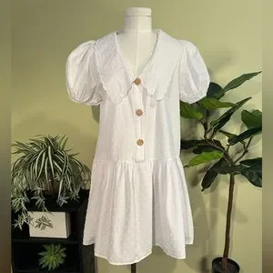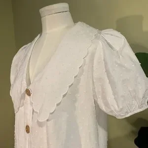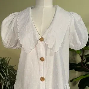 Textured cotton dress with large scalloped collar, balloon sleeves and wooden buttons for closure.