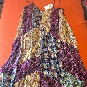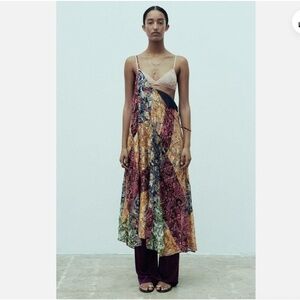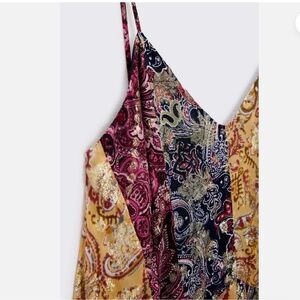 Zara The Shilo metallic shimmery spaghetti straps midi dress new with tags. Midi dress made of viscose blend fabric, v-neck in front and back, adjustable spaghetti straps, metallic thread appliqué. 89% viscose and11% metallised fibre, 100% polyester lining. Whimsical print with paisley, mandalas, etc.in a patchwork like pattern. This dress is gorgeous in person, so many cool details, it could be perfect as a beach cover up as well. Colour is accurate in the stock photos, mine are taken in artificial light. It’s a little wrinkled from storage and I don’t have an iron or steamer, sorry about that. Marked size M Medium but fits bigger in my opinion, please see measurements. All measurements are approximate and taken with the garment laying flat: Pit to pit 20’’ Total length from middle of chest 37’’. This item comes from a smoke free, pets friendly home. Recycled bags/box used when possible. Please, let me know if you'd like any additional info. Thanks for watching!