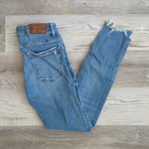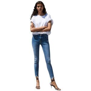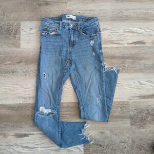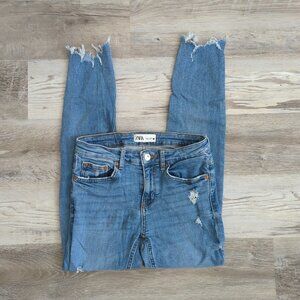 These are distressed mid-rise skinny jeans in blue stretch denim by Zara.