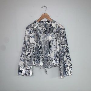 Zara Tied Button-down Shirt Size Small White Black Printed Top Flared Cuffs