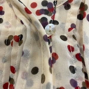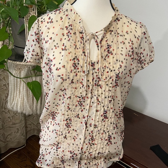 Beautiful lightweight blouse, perfect for the summer. Straight fit with elastic at the bottom to give you that blouson look. Cap sleeves, buttons up, key hole with tie or down tie it.