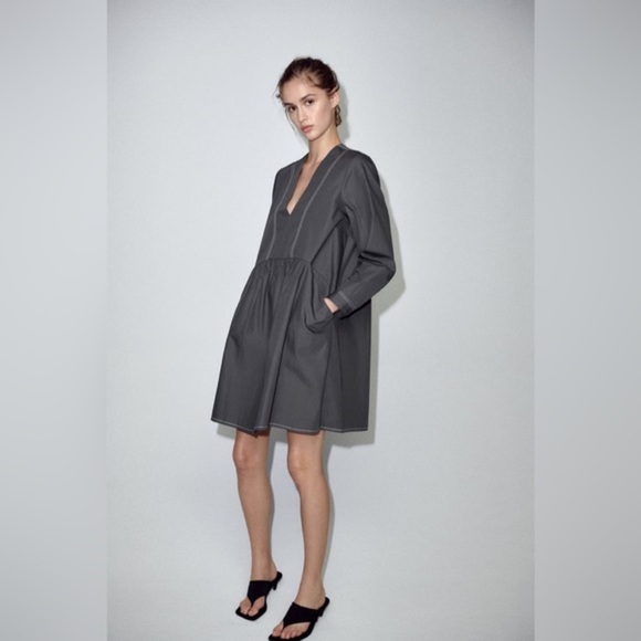 Zara Topstitched Mini Dress Size Small Cotton V Neck Long Sleeves 2 Front Pockets Same or next day shipping