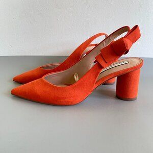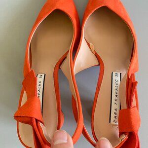 Zara Trafaluc Vibrant Orange Suede Heeled Shoes, fits Sz 8.5 med perfectly. Elastic on ankle strap for ease of movement, rounded 2.5" heels, padded footbed, pointy toe, open heel slingback. right shoe bow shows a small bit of discoloration as pictured, black spot on left underside sole as pictured, otherwise these beauties are in Great condition. From a smoke free/pet free home.