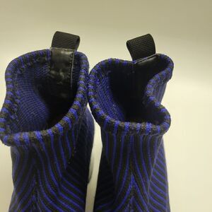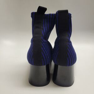 Zara Trafaluc artistic obtuse shiney black block heel sock boots in a black and electric blue striped stretch fabric. The shoe areas of the boot have structure and the upper ankle sleeve is just nice stretchy sock fabric.