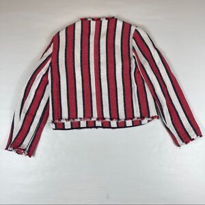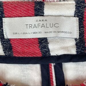Zara Trafaluc Red/White Full Zip Two Chest Pockets Plus Two Zip Pockets Woven Collarless Distressed Frayed Hems Blazer Size Large Cropped. Fabric Tag has been removed, but the fabric is a Cotton/Polyester/Viscose blend. Very good used condition. Please see photos for approximate measurements.
