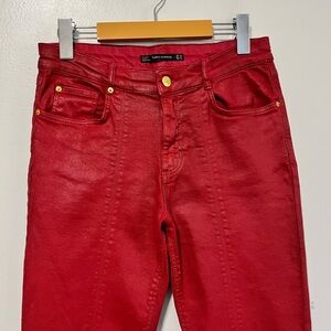 Keywords/Suggested Uses: Zara jeans, red jeans, coated denim, metallic jeans, zipper detail, raw hem, frayed hem, bootcut jeans, flare jeans, statement jeans, party jeans, edgy jeans.