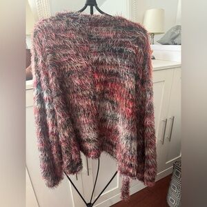 Beautiful and soft, this sweater has ties at bottom that can be tightened if looking for a waist cinching look or left loose and flowy for a bore boho effect. Generous size could fit up to large