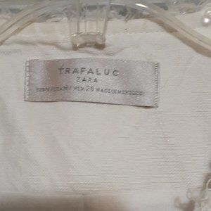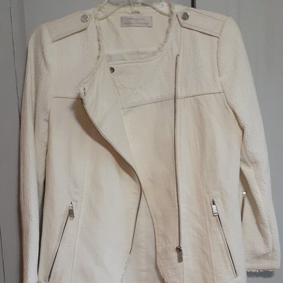 Beautiful, like new condition. Classy twist on the moto jacket style. Comfortable cotton/linen fabric with soft pebbled sleeves. Eyelash fringe trim around neckline and hems. Fully lined. Zippers and snaps details. Linen and cotton blend. Ivory/ light cream colour.