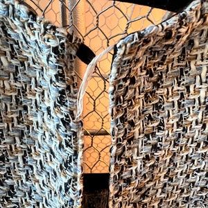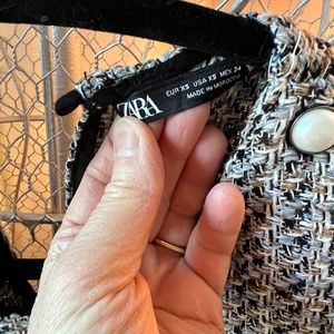 Super cute tweed top by Zara. In full disclosure, the back button fell off and will need to be replaced. Otherwise it is in excellent condition. Pearl buttons are a nice accent as are the cream trimmed cuffs on sleeves.