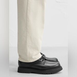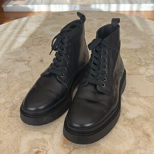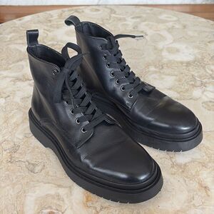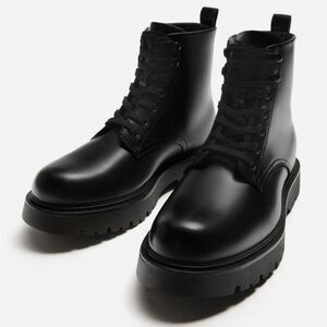 In excellent preowned condition Zara lace-up ankle boots. Lacing with seven pairs of eyelets. Back pull tab for ease. Chunky lug sole. Black vegan leather. Very comfortable!