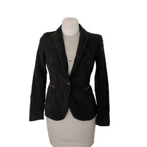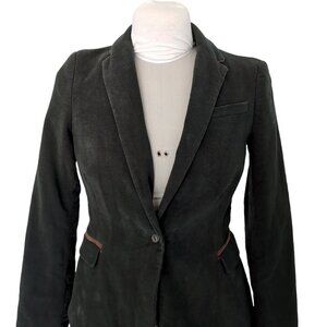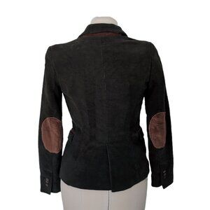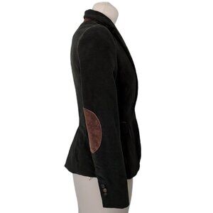 This is a hunter green velveteen blazer with brown corduroy elbow patches by Zara Basic. Fitted style.