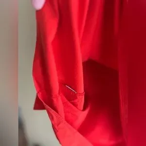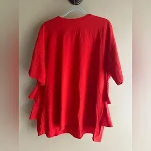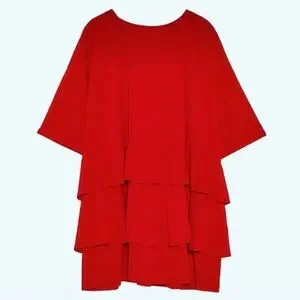 Bright red tunic with playful ruffles. Short sleeves. Chic and modern.