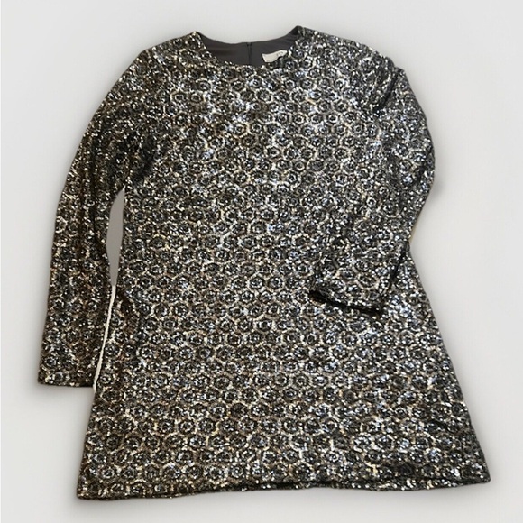 Zara W&B Sequin Short Shift Dress Silver Blue Long Sleeve sz L EUC
