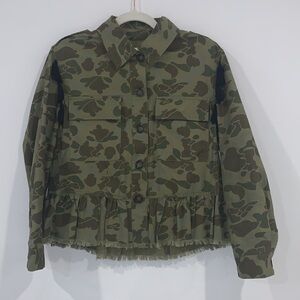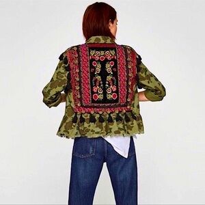 Zara WOMAN Camo Parka Jacket Peplum Pom Pom Embroidery size S