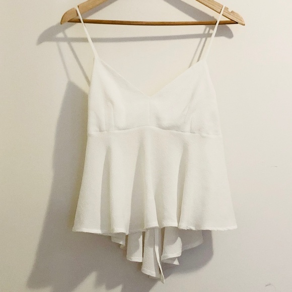 Zara white spaghetti strap v-neck blouse with an open back. The top fastens at the back with three clasps attached to small sections of white sheer material. The top looks slightly yellow in the photos, but it's just the lighting; it's actually white. It was worn once and is in like-new condition (except I cut out the tag).