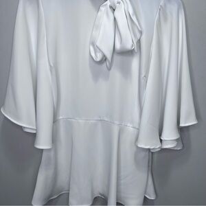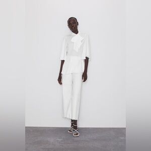 Zara White Peplum Blouse Batwing Sleeve Necktie Bow Size Small