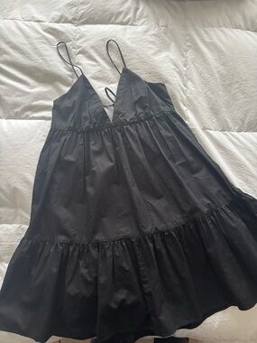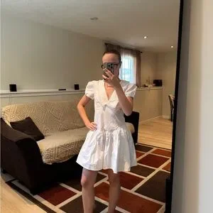Crisp white mini dress with a deep V-neck. Short puff sleeves and a fitted waist. Flowy tiered skirt adds movement. Clean, feminine silhouette for daytime styling.