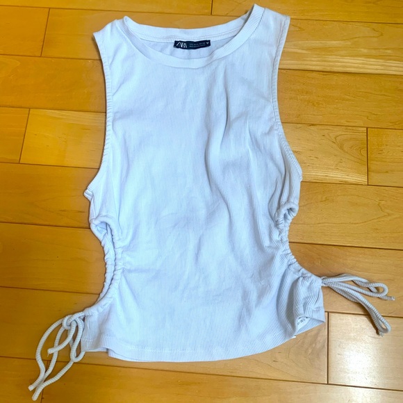 This stylish white tank top from Zara features a modern cut-out design with side tie details, offering a chic and adjustable fit. The sleeveless style and minimalist aesthetic make it a versatile addition to any wardrobe.