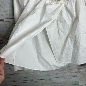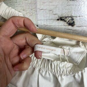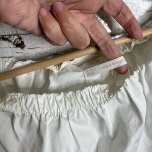 This Zara blouse features a chic smocked design with elegant bell sleeves, offering a stylish and breezy look. The white color enhances its versatility, making it a perfect choice for both casual outings and fashionable layering. Its ruffled details add a touch of sophistication to this timeless piece.