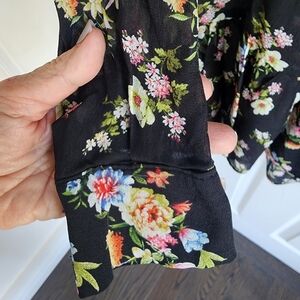 Beautiful Black Floral Voile Type Sheer Type Fabric. Ties at neck with mandarin style collar. Cute flounce at Hem. Flowy and comfortable