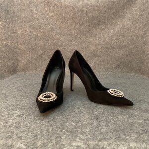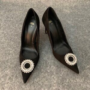 Zara Women Black Suede Pointed Toe Heel with Front Rhinestones Pump Shoes
