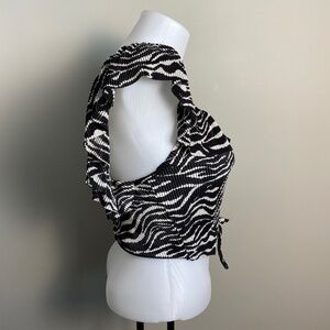 Zara Women's Black & White Pleated Ruffle Sleeveless Crop Top Cinch Waist Tie S