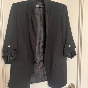 Blazer feature ruched buttoned sleeve, flap pockets, tuxedo lapels and built-in shoulder pads