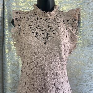 - Gorgeous Blush pink lace overlay with an attached slip underneath,Mockneck style, Ruffle detail at neck and sleeves ,Zipper in back,Knee length,Cap sleeves