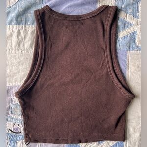 •This stylish brown tank top from Zara features a sleeveless design with a chic crop cut and a classic crew neckline.