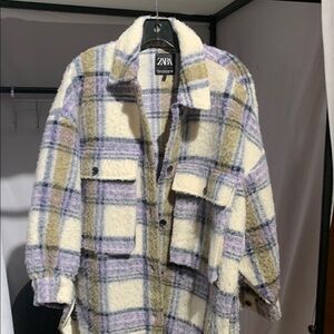 Zara Women's Checkered Teddy Jacket - Cream and Purple