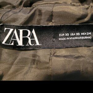 ZARA dark olive green jacket with hood. Womens size XS. Made from heavy, good quality material and has lining throughout the interior. Flared fit in the torso. Full length zipper + button closure.
