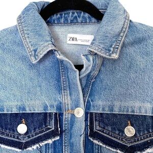 Medium wash denim jacket with dark accent pockets and trim on cuffs and hem.