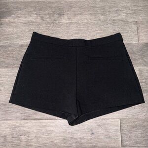 Elegant ZARA black high-waisted shorts in a structured woven fabric that holds its shape beautifully. Features faux front pocket detailing and a clean silhouette for a polished, modern look — perfect for pairing with a blouse and heels for a night out or with a tucked-in tee and sneakers for a chic everyday outfit.