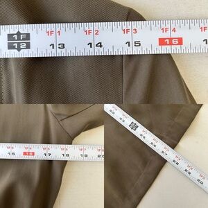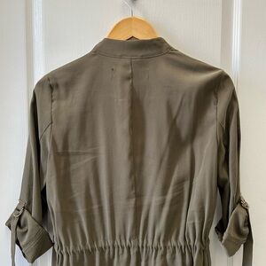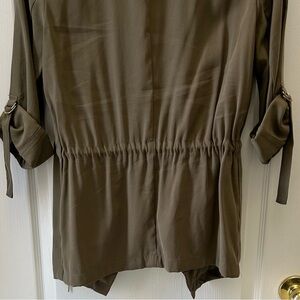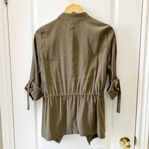 Chic khaki open front utility blazer jacket with flowy waterfall collar. Draped front with roll-up sleeves. Drawstring waist can be cinched to accentuate the waist. Side Pockets. Unlined. Ideal for layering.