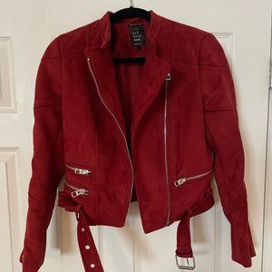 Stylish red jacket with zipper details. Perfect for a chic look.