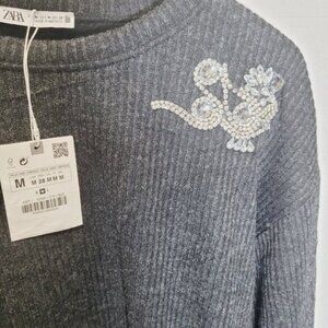 Zara Womens Sweater Med Ribbed Gray Embroidered Sequined NWT