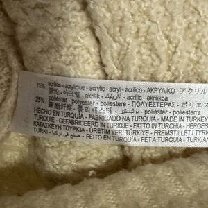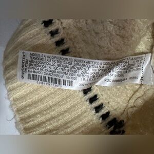 Chic and warm textured sweater by Zara. Features a classic crew neck design & beautiful colours. Ideal for layering. Previously owned, gently used with slight visible wear & washing wear in area throughout. Warm and cozy. Please view last two photos for laying flat size visual for measurements. Made of polyester & acrylic.